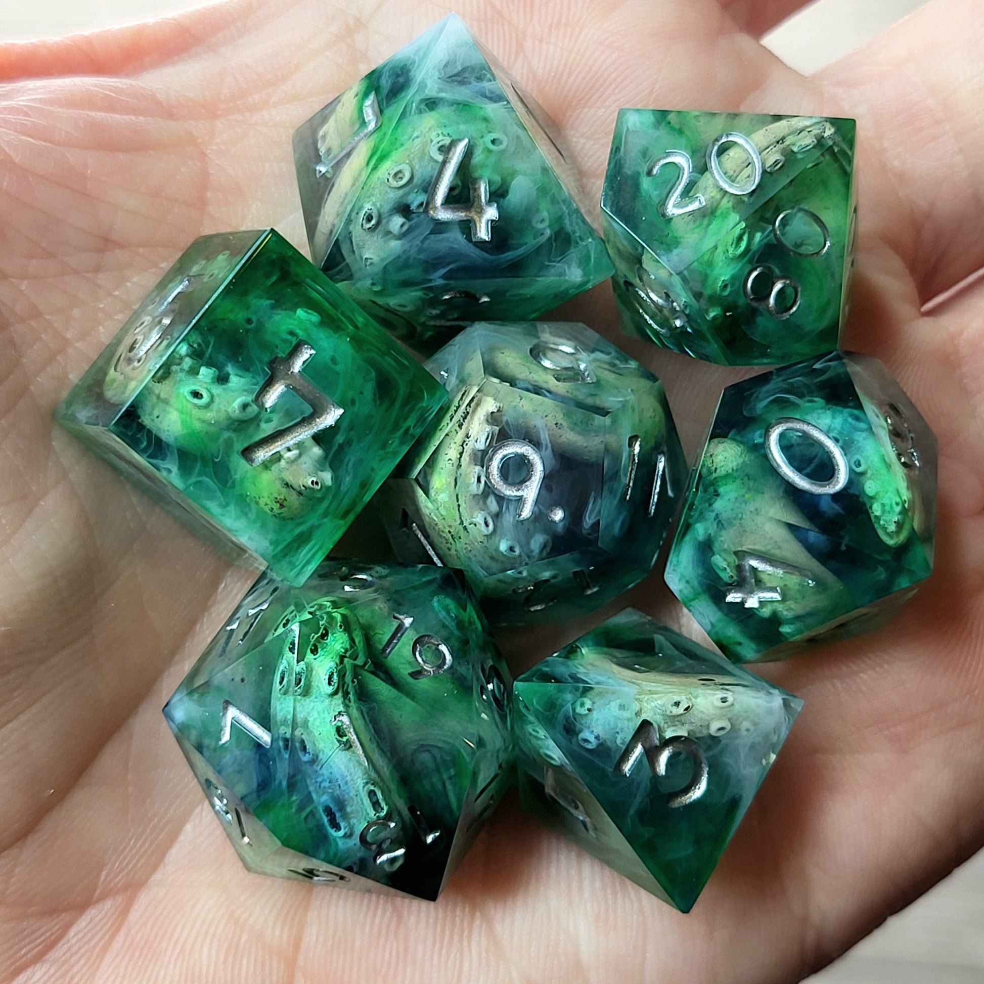 Call of cthulhu dice set kraken tentacles green resin and silver numbers